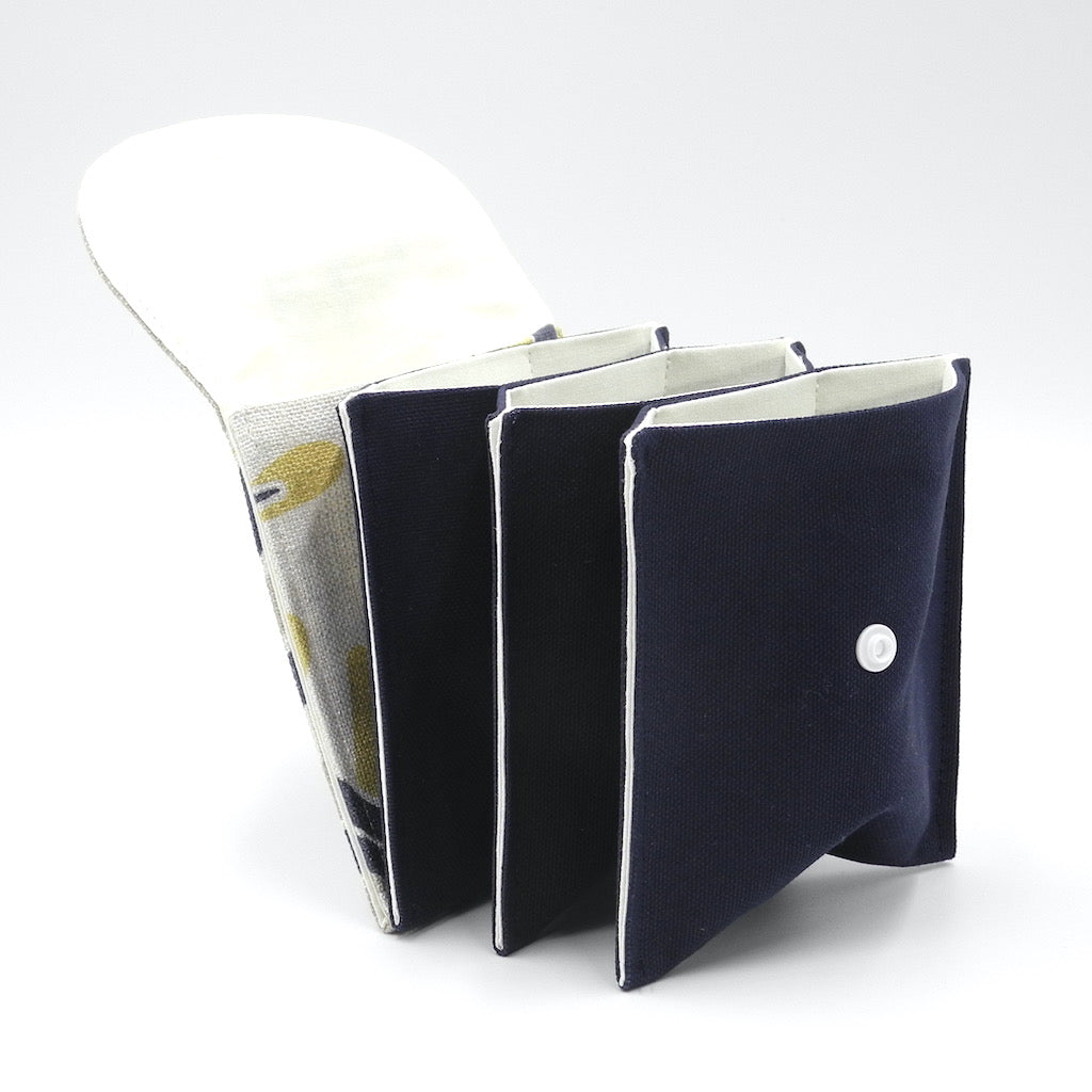 The accordion pouch has 4 larger pouches and 3 small slots. Snap closure to keep everything in place. Fully lined.
