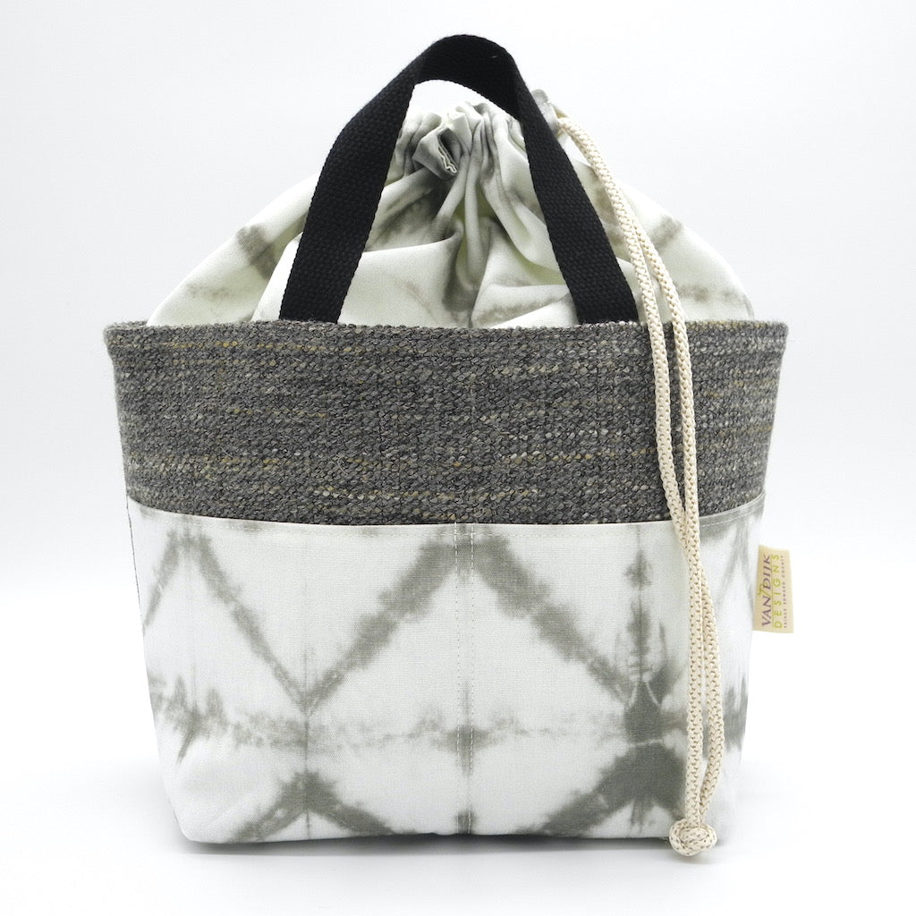 The ultimate project tote bag. Similar in size to the knitting basket but with the added drawstring top. Pockets on the outside for easy access to notions or patterns.